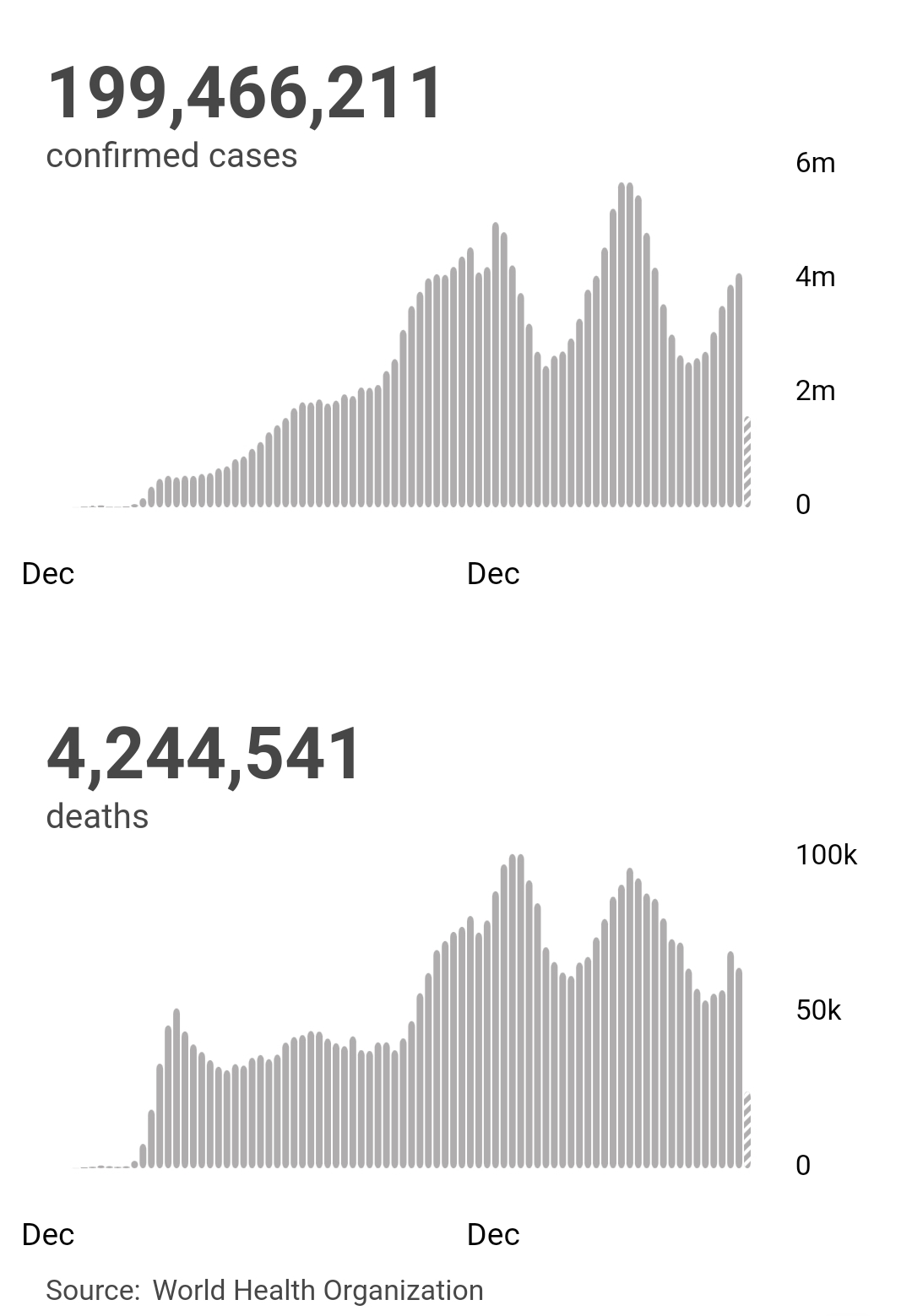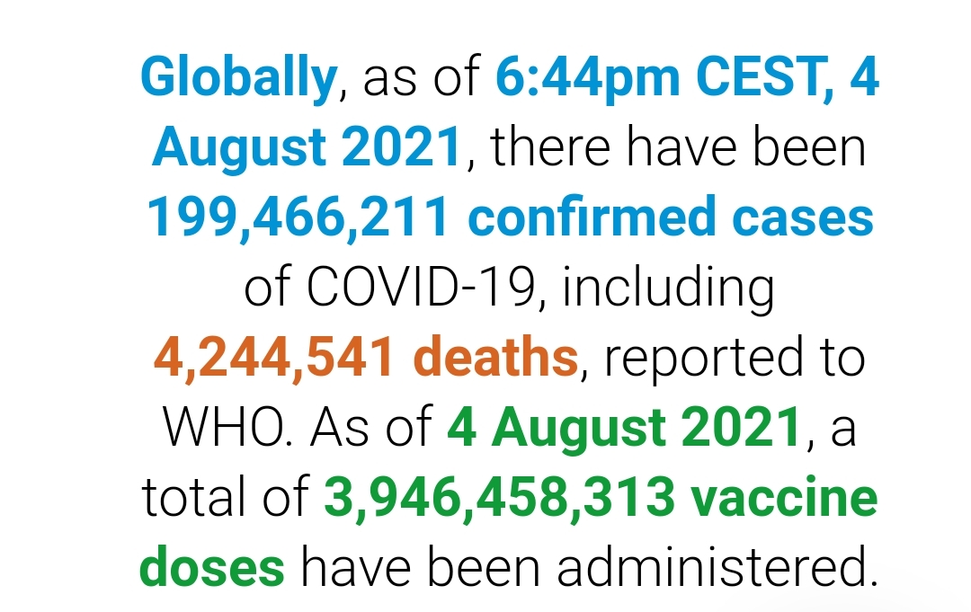 根据世界卫生组织最新实时统计数据,截至欧洲中部夏令时间8月4日18时44分(北京时间8月5日0时44分),全球新冠肺炎确诊病例累计达199466211例,累计死亡4244541例。4日,全球新增新冠肺炎确诊病例548167例,新增死亡病例8430例。(总台记者 薛婧萌)