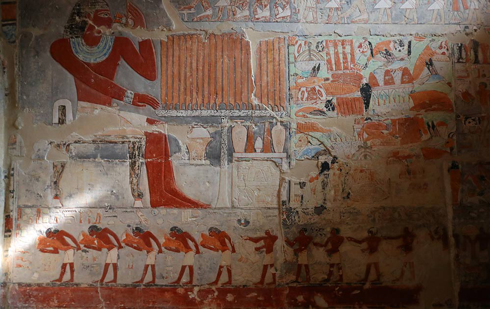 埃及首都开罗以南的塞加拉地区,一个官员墓内拍摄的彩绘浮雕壁画,距今已4000多年。