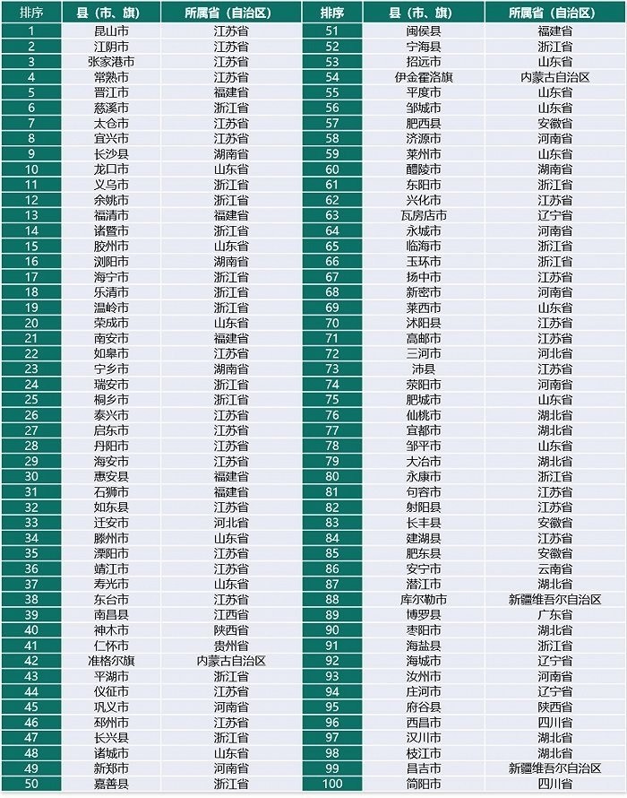 具体来看,前十名中,江苏省占六席,包揽前四(昆山、江阴、张家港、常熟)。太仓保持第7名,宜兴首次进入前十,排名第八,较去年上升3个位次。