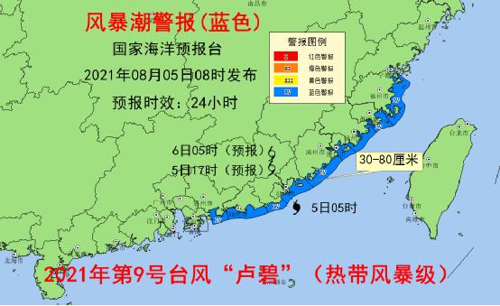 同时预计8月5日上午至6日上午,广东惠州至福建福州沿海将出现30~80厘米的风暴潮增水。上述岸段内的潮位站将不会出现达到当地蓝色警戒潮位的高潮位。风暴潮预警级别为蓝色。