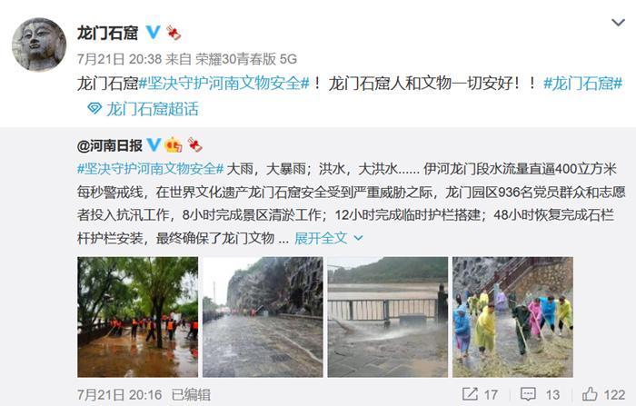 “风雨中,舍命坚守,文物人咬紧牙关,拼尽全力,”河南省文物局局长田凯在朋友圈中写道,“作为文物工作者,文物的安全比我们的生命重要。我泪流满面……”
