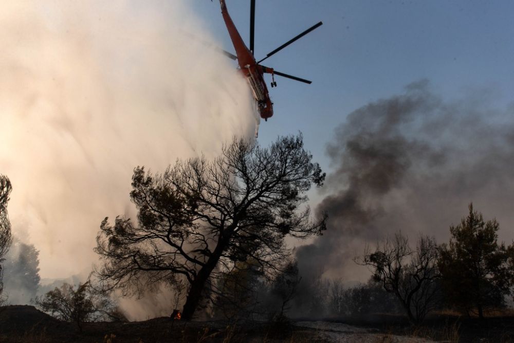 8月4日,一架消防直升机在希腊雅典北部郊区灭火。(新华社发,马里奥斯·罗洛斯摄)