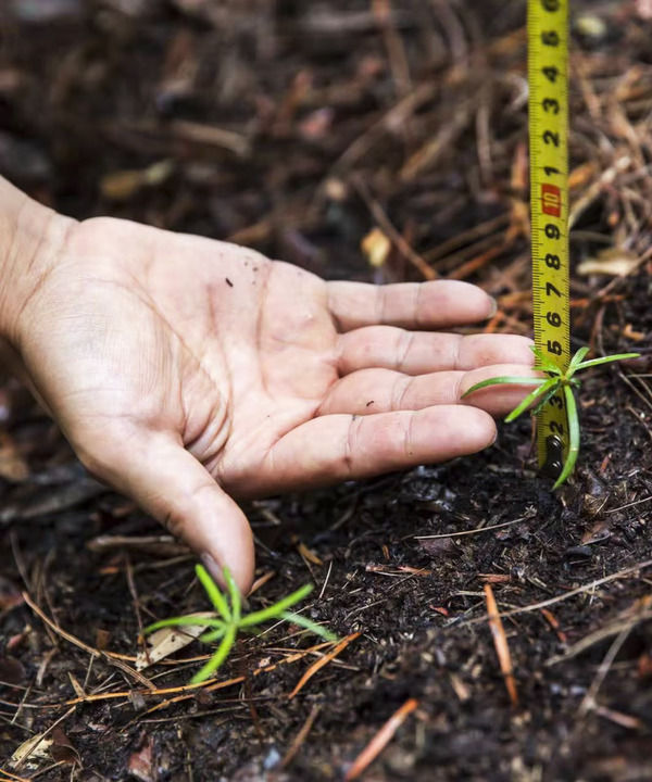 “长势不错。”周洪艳蹲下身,轻轻拉出卷尺。一株幼苗细长的叶片四散开,像一只绿色蜘蛛伸出的脚。