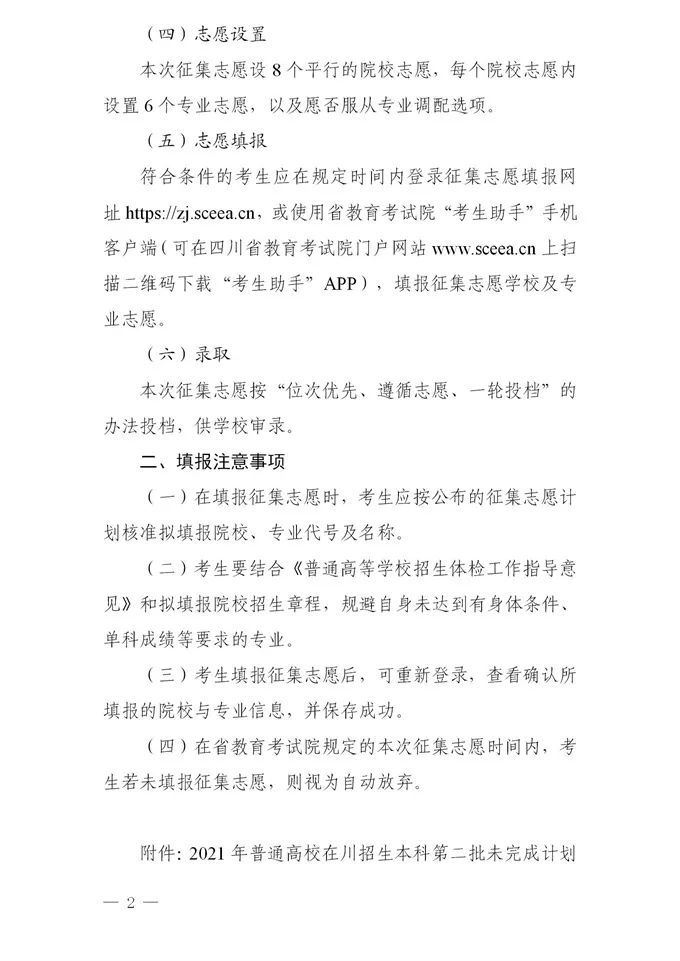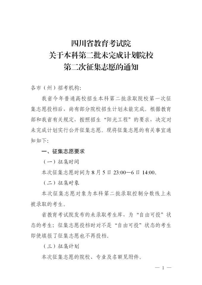 8月5日晚,四川在线记者从四川省教育考试院获悉,四川将对本科第二批未完成计划院校进行第二次征集志愿,详情如下: