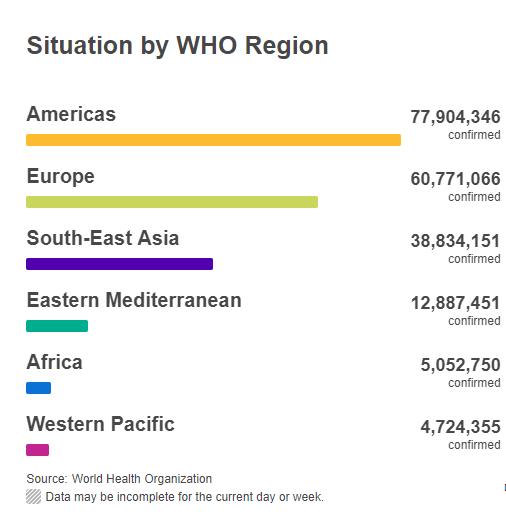 △全球六个区域疫情数据 图片来源:世卫组织