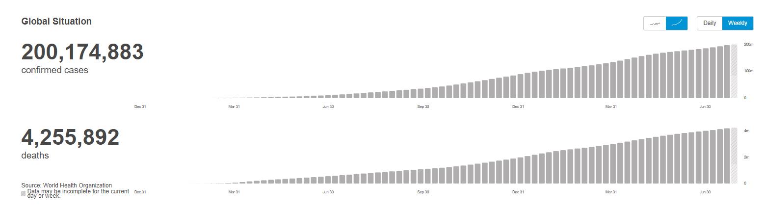 世卫组织在4日发布的最新一期每周疫情报告中警告说,全球新增病例数已经连续一个多月保持增长势头。世卫组织总干事谭德塞5日在世卫组织成员国每周例行通报会上说,“现在世界正面临真正的危险,我们已经取得的防疫成果正在被侵蚀。全球报告的累计确诊病例数即将超过2亿(谭德塞发言时数据还未更新),而真实的感染数字实际上要高得多。”
