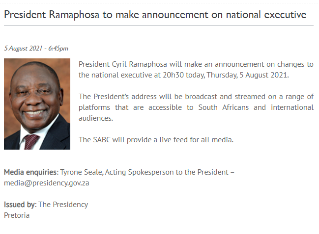 拉马福萨表示,由于南非总统府部长杰克逊·姆坦布于2021年1月因新冠肺炎去世,穆凯兹申请辞去南非卫生部部长职务,姆博韦尼申请辞去南非财政部部长职务等,导致南非政府多部门出现主要负责人空缺,同时为加强该国对情报信息的管理、避免再次出现骚乱,因此决定取消南非国家安全部,相关情报职责将由总统府直接管理。鉴于公共卫生的重要性,将南非人居、水利和公共卫生部拆分为南非人居部和南非水利和公共卫生部。