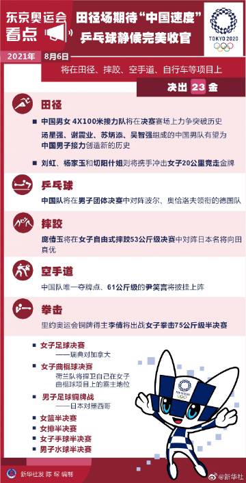 【东京奥运今日看点:田径场期待“中国速度”】东京奥运会今天将决出23枚金牌。#中国男女4X100米接力队出战决赛#,争取突破历史。刘虹、杨家玉和切阳什姐将携手冲击女子20公里竞走金牌。乒乓球迎来收官战,#中国乒乓男团力争四连冠#。在空手道、摔跤等项目上,中国队亦有冲金可能。#中国队加油#!