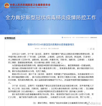 截至8月5日24时,据31个省(自治区、直辖市)和新疆生产建设兵团报告,现有确诊病例1370例(其中重症病例34例),累计治愈出院病例87492例,累计死亡病例4636例,累计报告确诊病例93498例,现有疑似病例3例。累计追踪到密切接触者1115176人,尚在医学观察的密切接触者40990人。