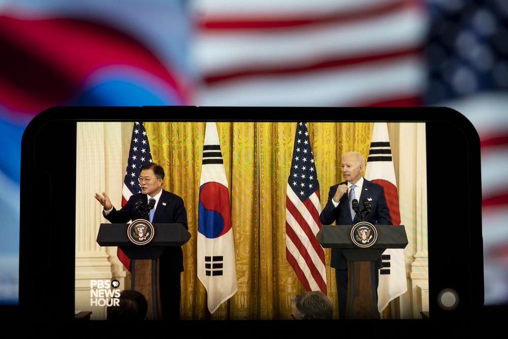 5月21日拍摄的美国总统拜登与到访的韩国总统文在寅在白宫举行联合记者会的视频直播画面。新华社记者刘杰摄
