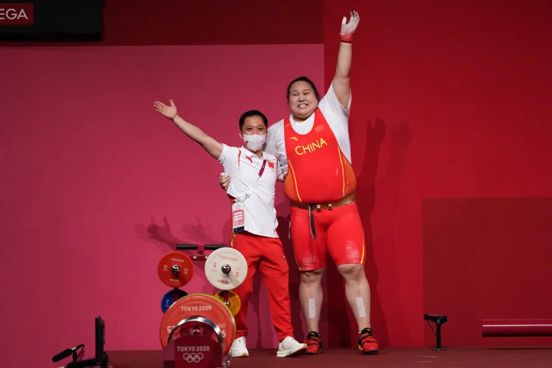 于杰教练冲上了举重台将弟子抱起庆祝