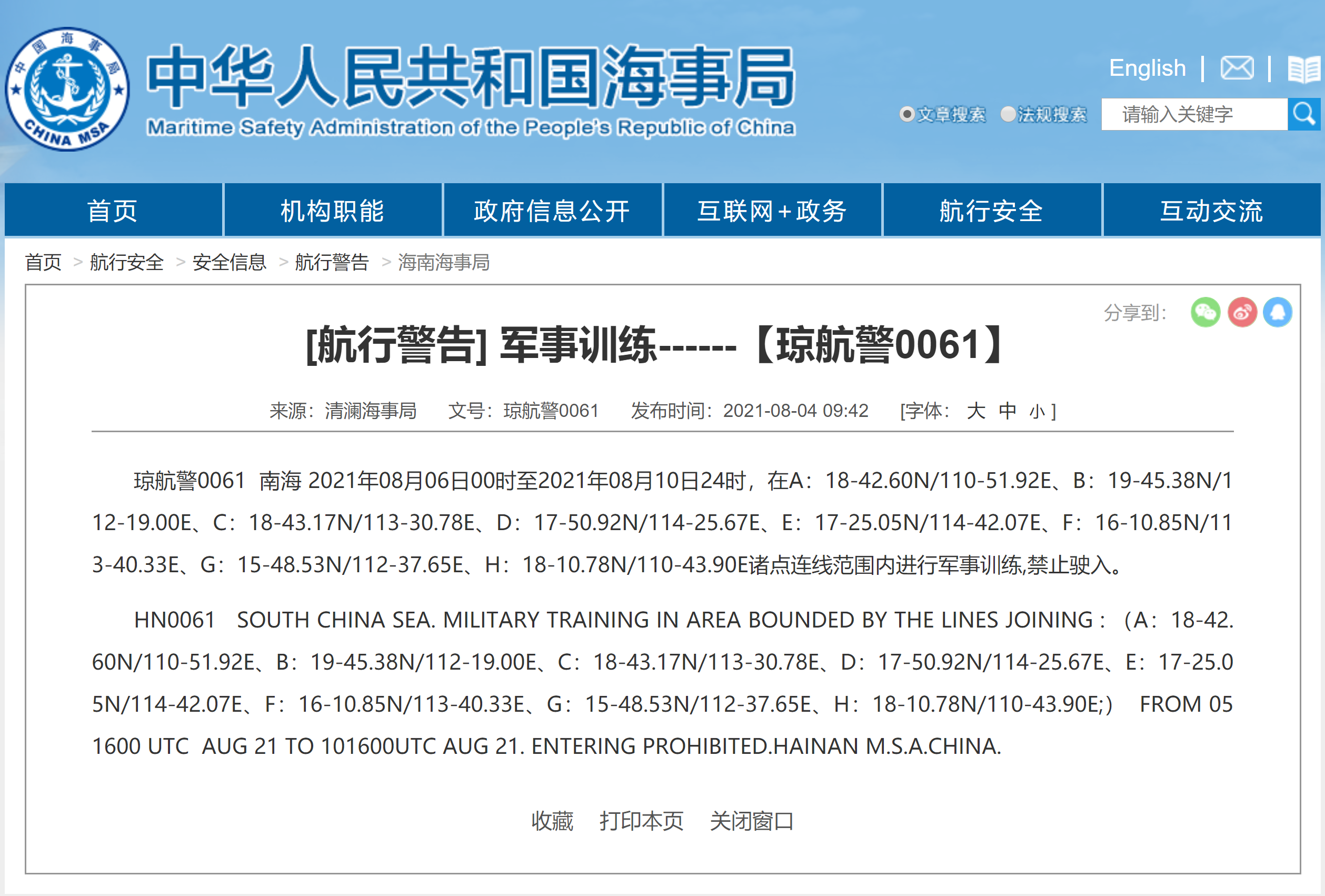 据中国海事局网站消息,海南清澜海事局发布航行警告,8月6日0时至8月10日24时,南海部分海域将进行军事训练,禁止驶入。
