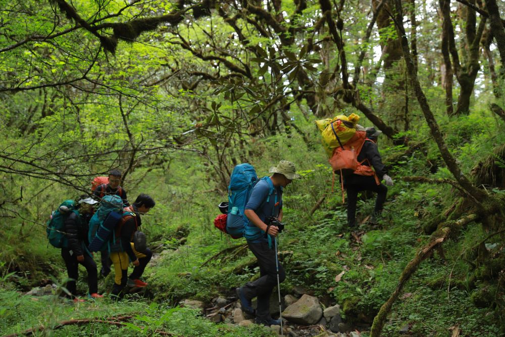 此行全程53公里,其中核心区穿越线路29公里。在5名当地向导的带领下,刘勇团队从海拔3280米的荣宏得草甸翻山越岭向南进入原始森林。在完全没有道路的无人区内,他们在山林、河谷和绝壁之间摸索跋涉,最艰难处9个小时只前进了短短3.7公里。