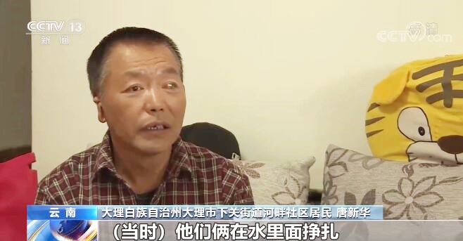 云南省大理白族自治州大理市下关街道河畔社区居民 唐新华:当时他们两个在水里面挣扎,(我)跑到那边跳到水里,游到了旁边将近70米时,人已经不见了,他们两个落(沉)下去了。我就伸手抓下去,抓到了一个人的手,就把两个人提上来了。