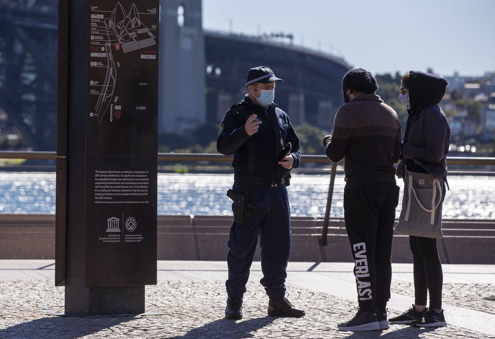 7月18日,在澳大利亚悉尼,行人和执勤警察交谈。(新华社记者白雪飞摄)