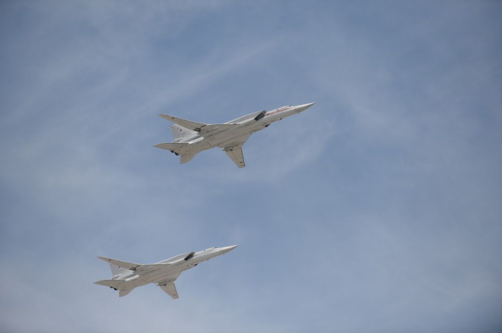 2015年5月9日,在俄罗斯首都莫斯科红场,参加阅兵式的图-22M3战略轰炸机从红场上空飞过。(新华社记者贾宇辰摄)