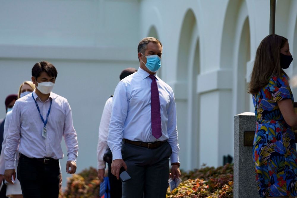 7月28日,在美国华盛顿白宫,记者们戴着口罩走向新闻简报室。(新华社发,沈霆摄)