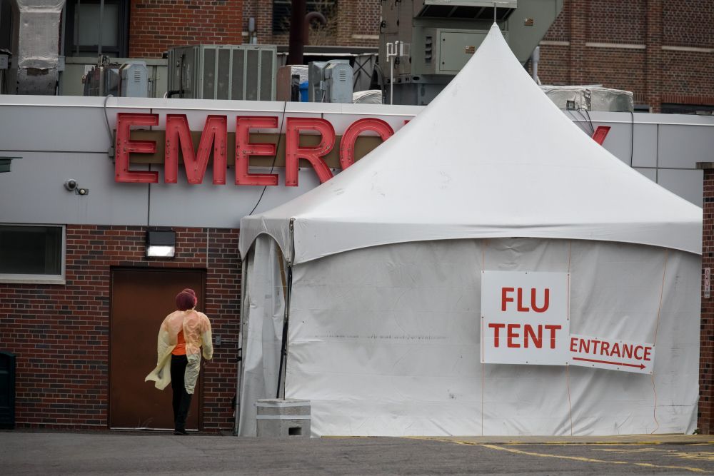 2020年4月19日,在美国纽约一家医院外,医护人员从写有“流感帐篷”字样的帐篷外走过。(新华社发)