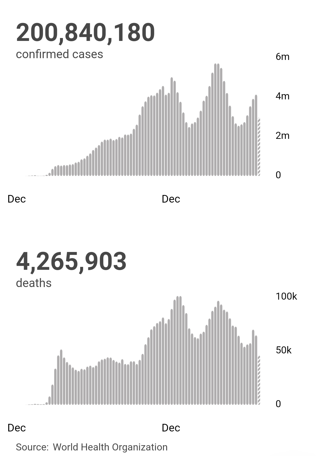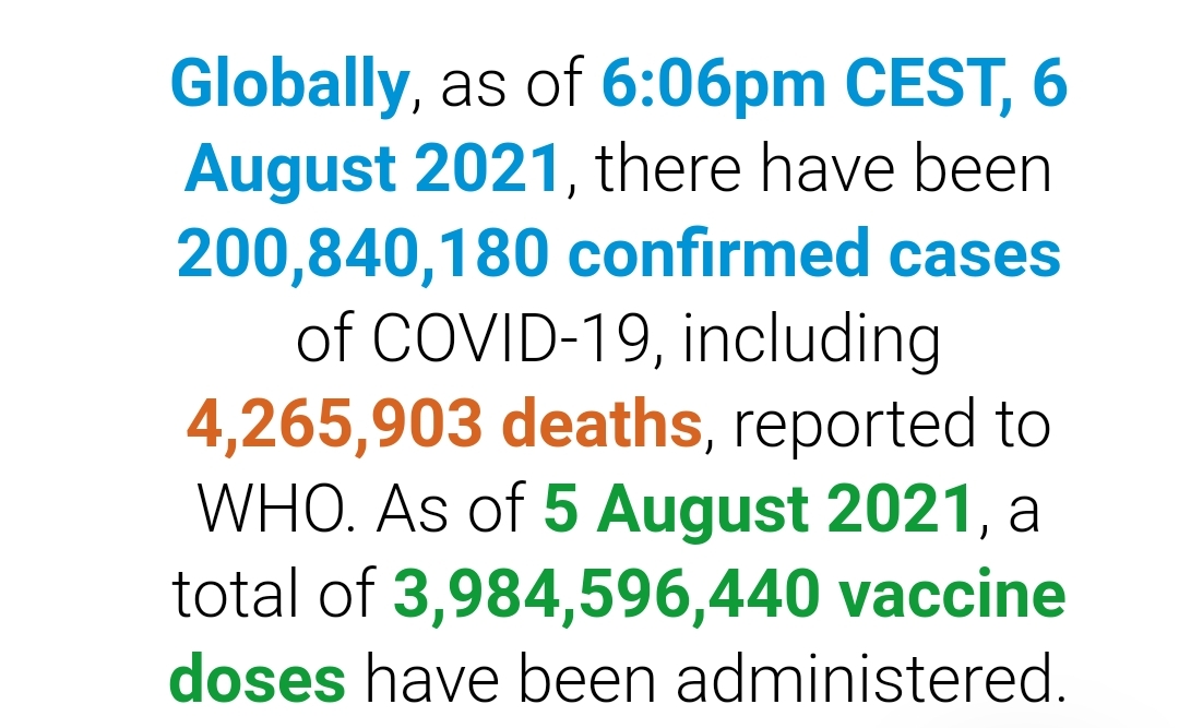 根据世卫组织最新实时统计数据,截至欧洲中部夏令时间8月6日18时06分(北京时间8月7日0时06分),全球累计新冠肺炎确诊病例200840180例,累计死亡病例4265903例。6日全球新冠肺炎确诊病例新增635150例,死亡病例新增9764例。(总台记者 薛婧萌)