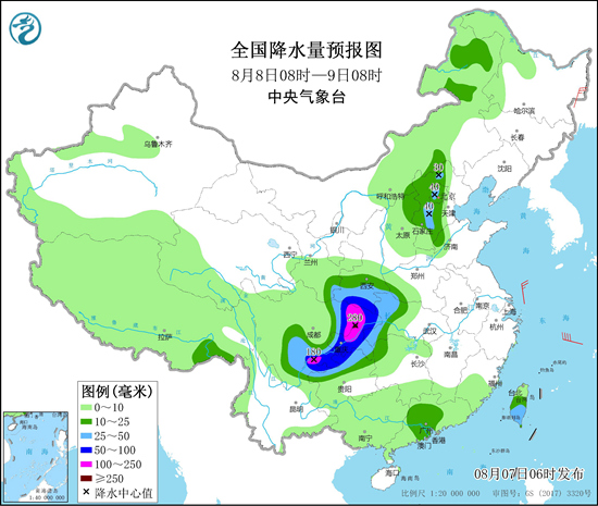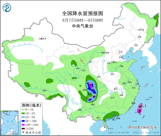 今天(8月7日),台风“卢碧”仍将制造风雨天气,其中浙江、福建和台湾岛的沿海地区将有6~7级大风,台湾岛中南部局地有特大暴雨。此外,今天至9日,西南地区大部和西北地区东南部将迎来一次强降雨过程,四川盆地东部等地有大暴雨。提醒上述地区需加强防范山洪、泥石流等次生灾害。