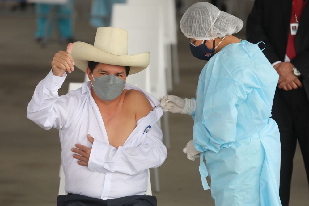 8月6日,秘鲁总统卡斯蒂略(左)在首都利马一处社区公园的新冠疫苗接种点接种中国国药疫苗。新华社发(秘鲁安第斯通讯社供图)