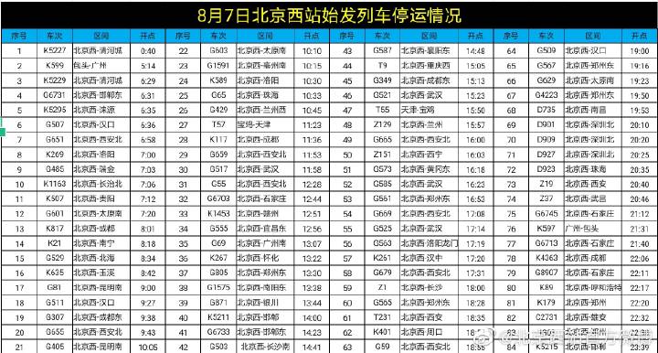 受多地遭受持续强降雨影响,结合疫情防控有关要求,8月7日北京西站84趟始发列车停运。已购买停运列车车票的旅客,可于30日内办理全额退票手续。