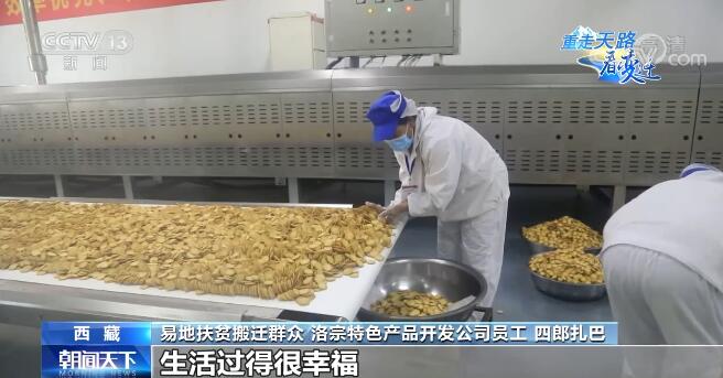 易地扶贫搬迁群众 洛宗特色产品开发公司员工 四郎扎巴:我这个车间主要负责洗青稞、青稞剥皮,我妻子在泡菜车间工作,她每月2400元,我们俩加起来一年也有6万多(元)收入,以前一年收入不到1万(元),搬过来以后在这边实现就业,收入各方面都很稳定,生活过得很幸福。