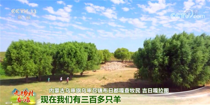 内蒙古乌审旗乌审召镇布日都嘎查牧民 吉日嘎拉图:我们这个沙场以前是黄黄的黄明沙,生活不成,八几年整体承包的时候十几只羊都放不成,现在我们有三百多只羊,还有五十多头牛了。