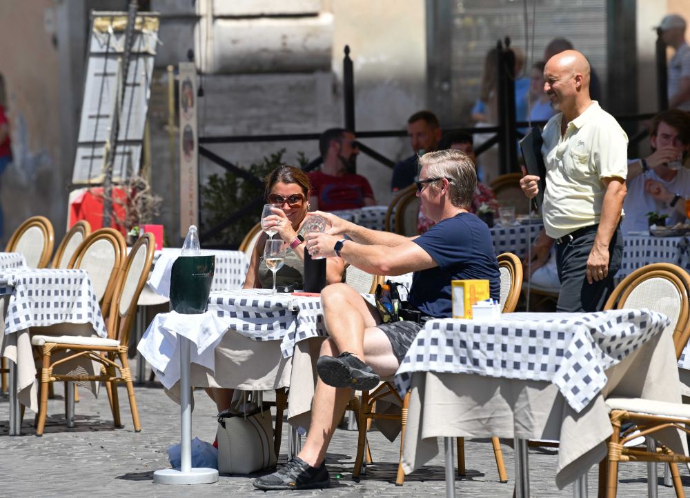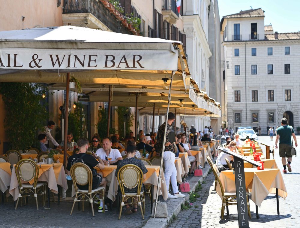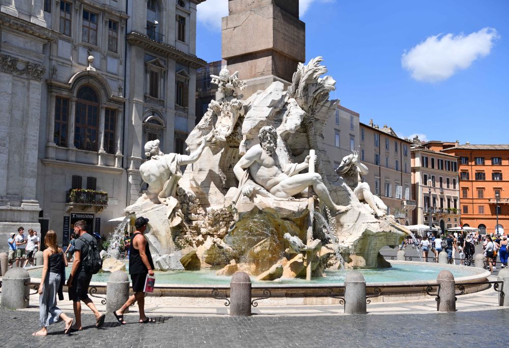 ↑人们在罗马纳沃纳广场四河喷泉附近休闲、用餐。