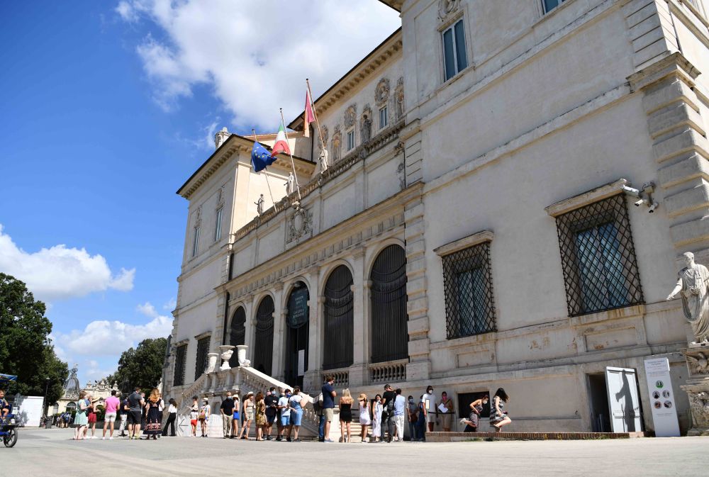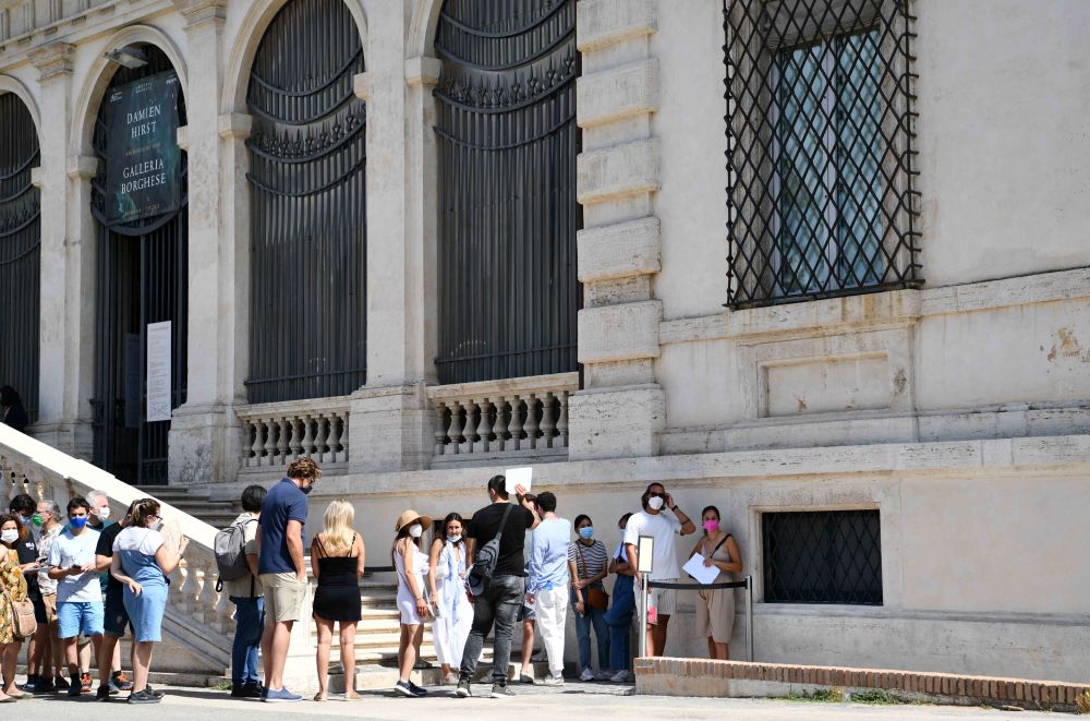 ↑游客在罗马博尔盖塞美术博物馆外排队等待“验码”进入。