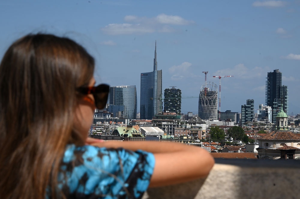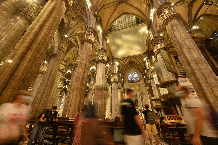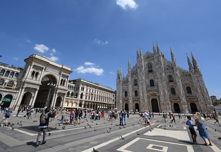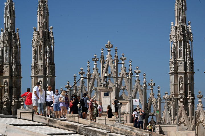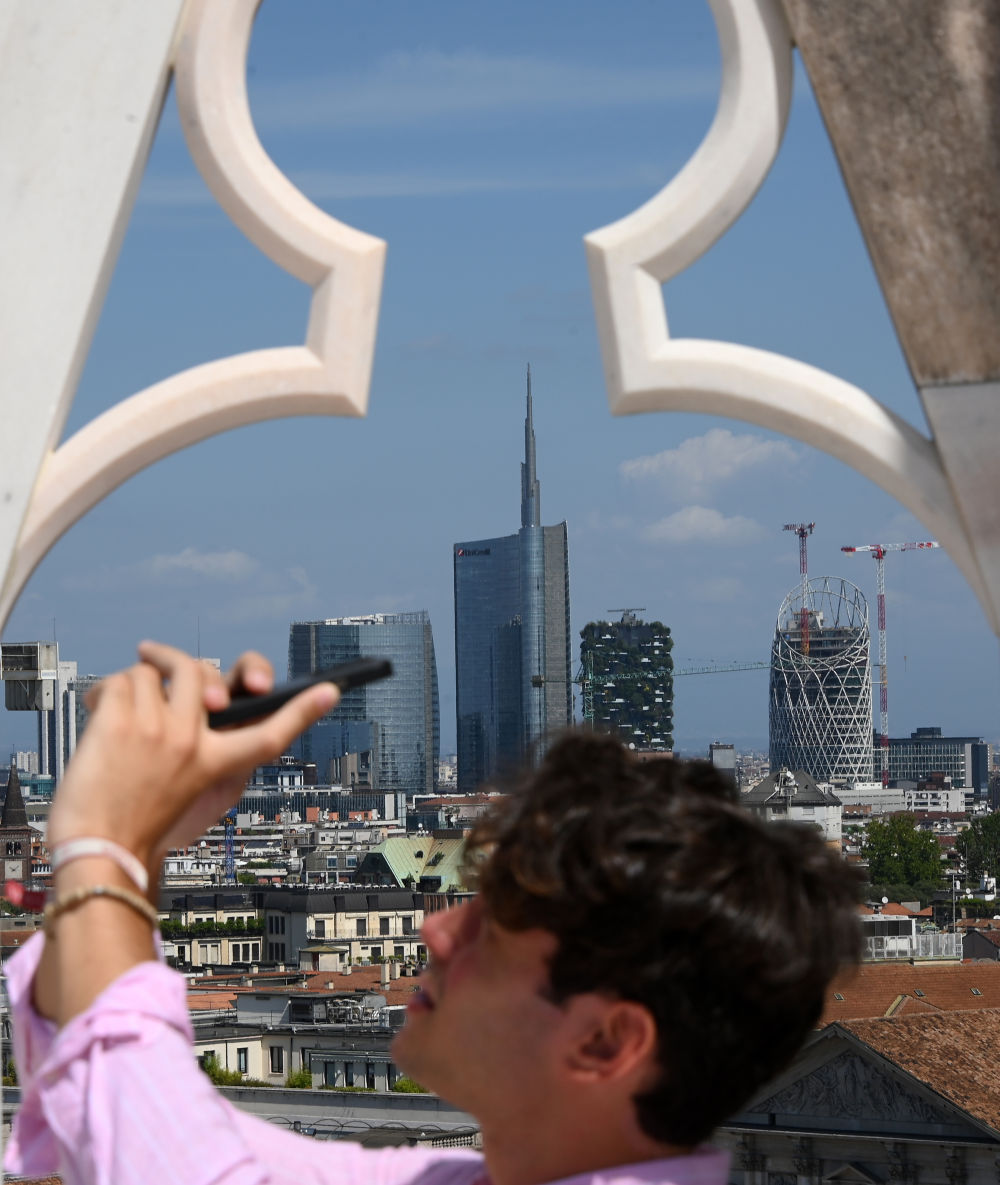 ↑工作人员在米兰大教堂一处入口查看游客的“绿色通行证”。
