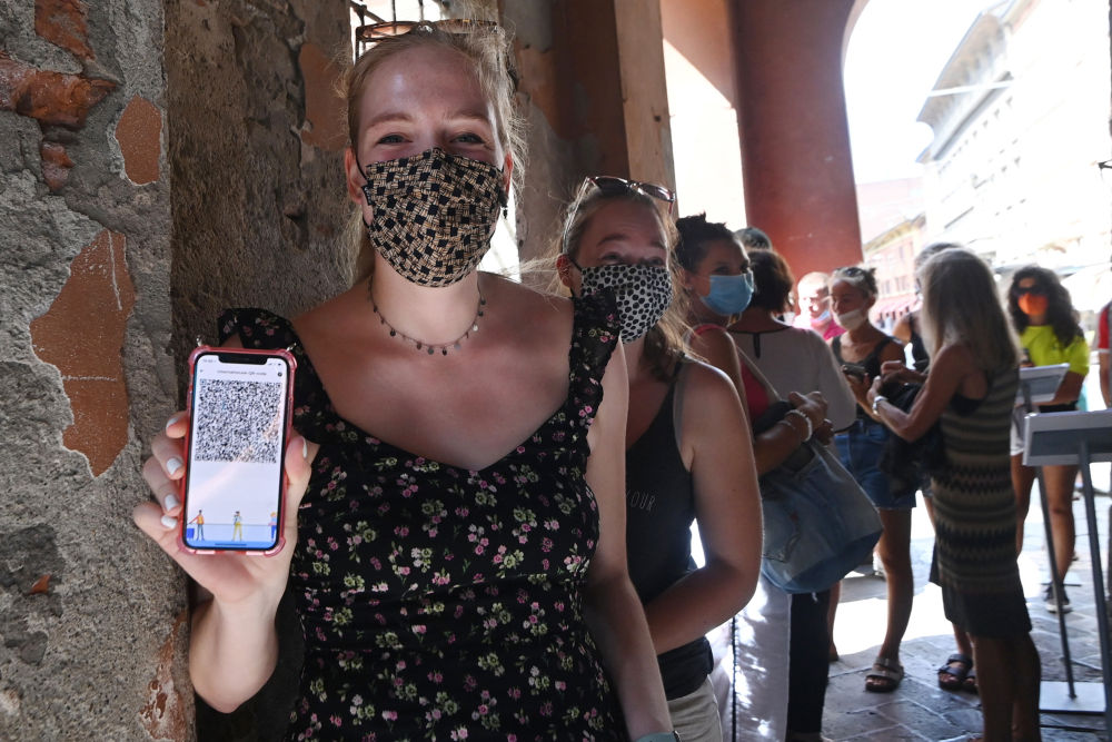 ↑一名游客在博洛尼亚阿西内利塔入口处展示“绿色通行证”。这就是意大利的“绿码”啦!