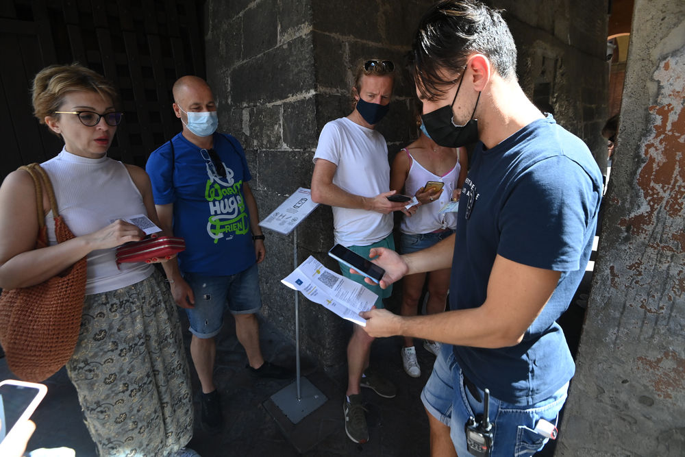 ↑工作人员在博洛尼亚阿西内利塔入口处查看游客的“绿色通行证”。