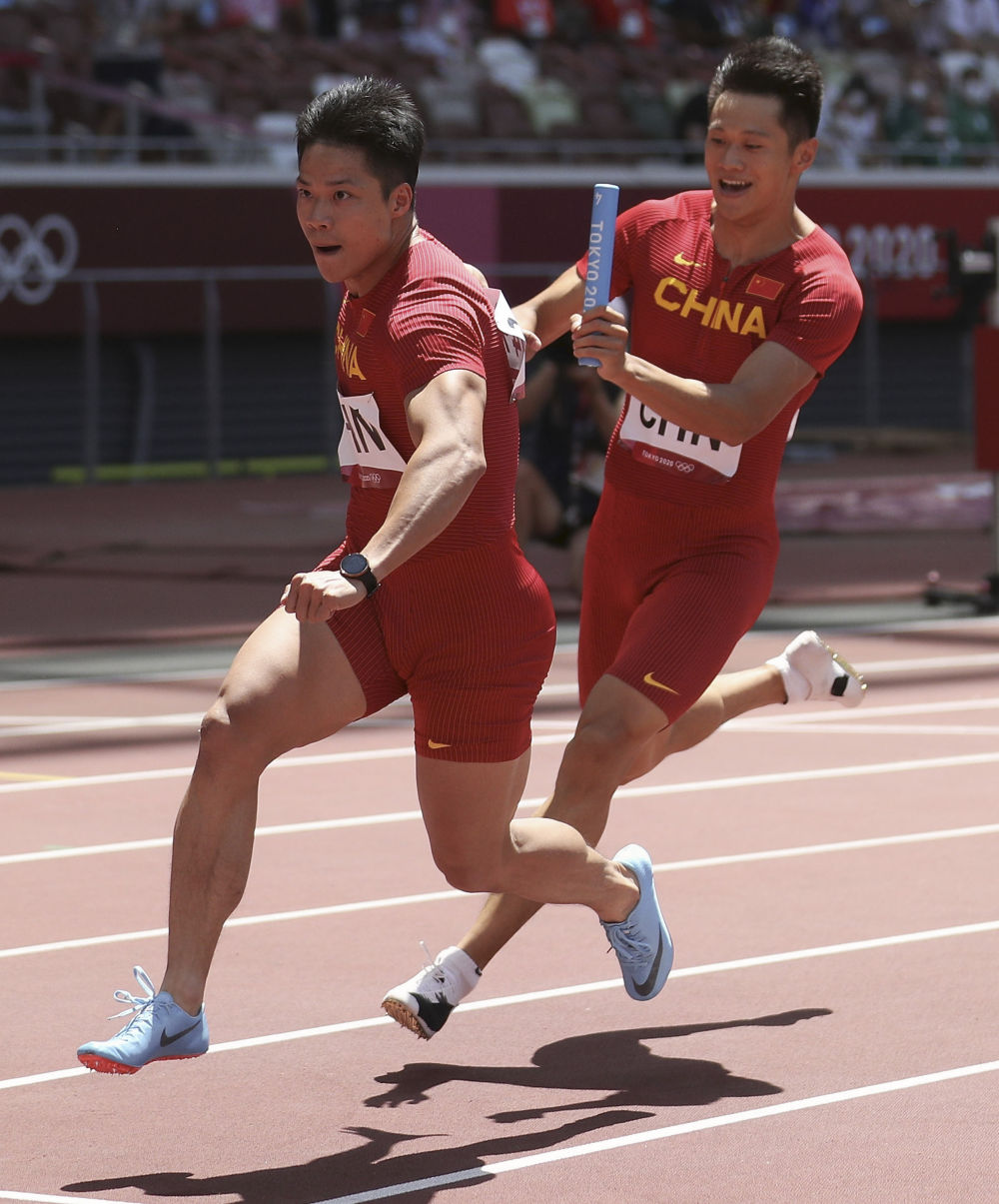 8月5日,中国队队员苏炳添(左)和谢震业在东京奥运会田径男子4x100米接力预赛中交接棒。
