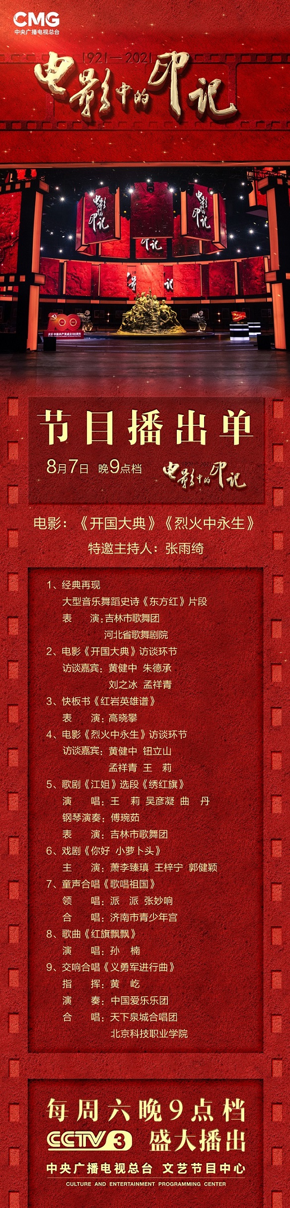 中央广播电视总台暑期档特别节目《电影中的印记》,第六期节目将于8月7日晚9点,在CCTV-3(综艺频道)播出。特邀主持人张雨绮将和众位嘉宾一道,带领大家重温《开国大典》、《烈火中永生》两部电影。