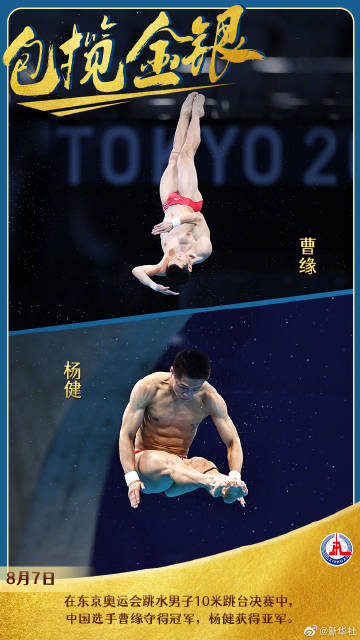 【再添一金一银!#东京奥运中国队第10次包揽金银# 】今天,在东京奥运会跳水男子10米跳台决赛中,中国选手曹缘夺得冠军,杨健获得亚军。祝贺#跳水梦之队七金五银完美收官#!