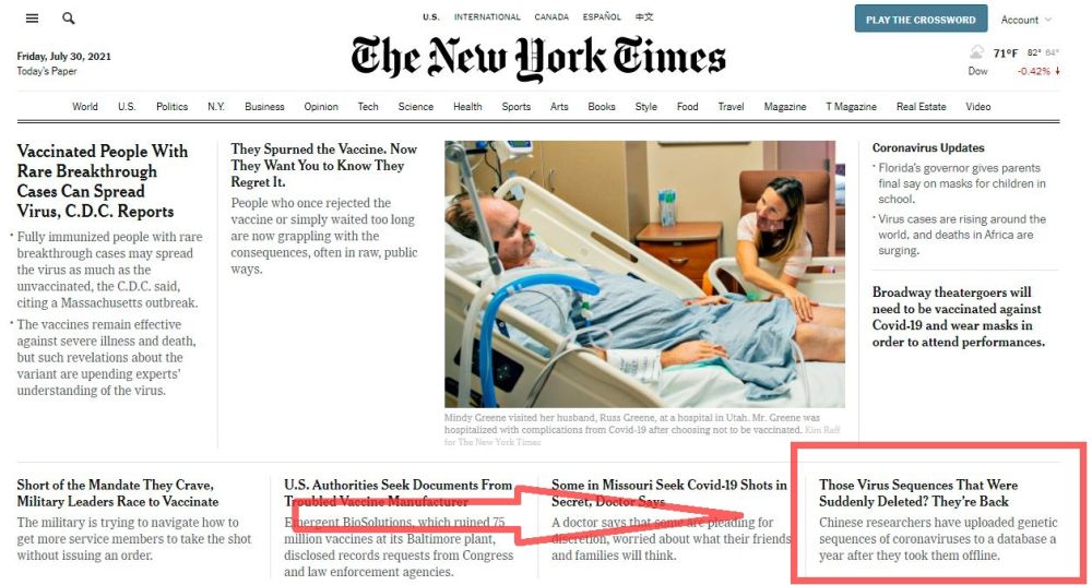 《纽约时报》也注意到了相关舆论,其专栏作家卡尔·齐默7月30日发表报道,援引了新华社记者对中方科研人员的专访,并采用了专访中两个核心观点:首先,删除数据是技术原因,与所谓掩盖新冠疫情起源无关。其次,涉及的数据采样时间较晚,对新冠溯源毫无价值。