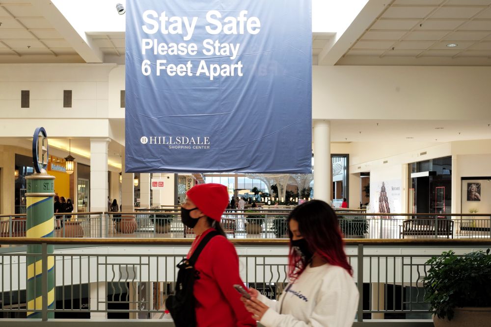 8月4日,美国旧金山湾区圣马特奥市一个购物中心内挂着写有“注意安全,请保持6英尺社交距离”字样的条幅。(新华社记者吴晓凌摄)
