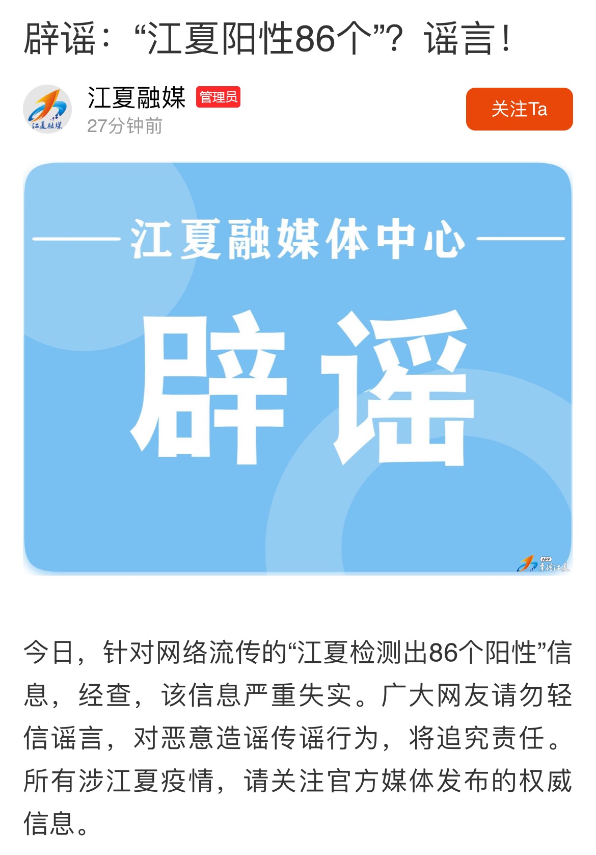 广大网友请勿轻信谣言,对恶意造谣传谣行为,将追究责任。所有涉江夏疫情,请关注官方媒体发布的权威信息。