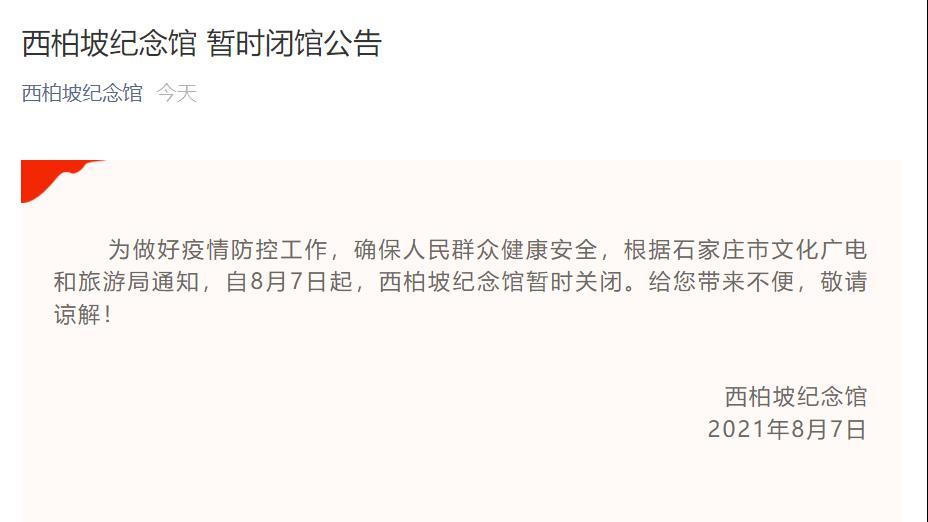 今天(8月7日)西柏坡纪念馆发布通知,为做好疫情防控,确保人民群众健康安全,根据石家庄市文化广电和旅游局通知,自8月7日起西柏坡纪念馆暂时关闭。(总台记者 郭晓平)