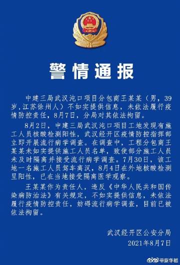【#武汉经开区一项目责任人未依法履行防控责任被拘留#】8月7日晚,武汉警方发布通报:中建三局武汉沌口项目分包商王某某(男,39岁,江苏徐州人)不如实提供信息,未依法履行疫情防控责任,8月7日,武汉经开区公安分局对其依法拘留。