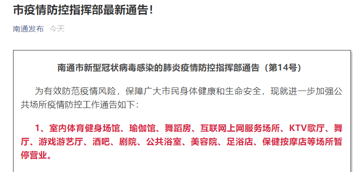 央视网消息:据“南通发布”官方微信消息,为有效防范疫情风险,保障广大市民身体健康和生命安全,南通市现就进一步加强公共场所疫情防控工作通告如下: