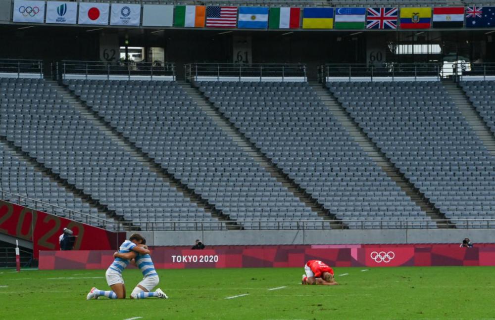 7月28日,男子七人制橄榄球铜牌赛在东京体育场举行,阿根廷队夺得铜牌。赛后,两名阿根廷队员拥抱在一起庆祝胜利。