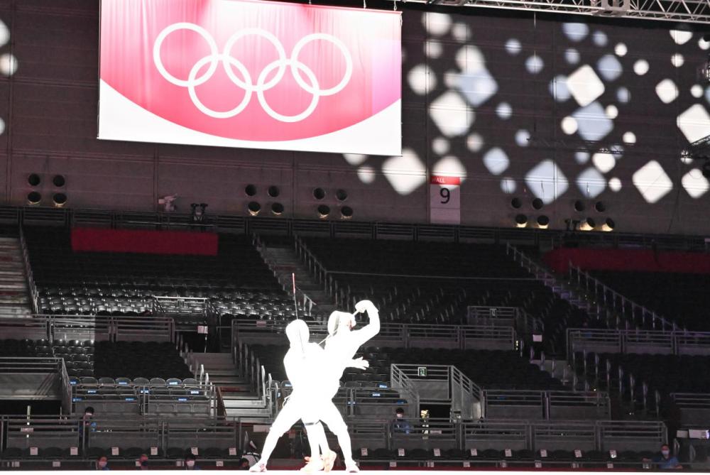 8月1日,幕张国际会展中心,男子重剑团体决赛。通常拍摄击剑比赛是,为了保证比赛瞬间的拍摄效果,看台会很暗,而在过曝情况下,看台的空空荡荡再次显露。