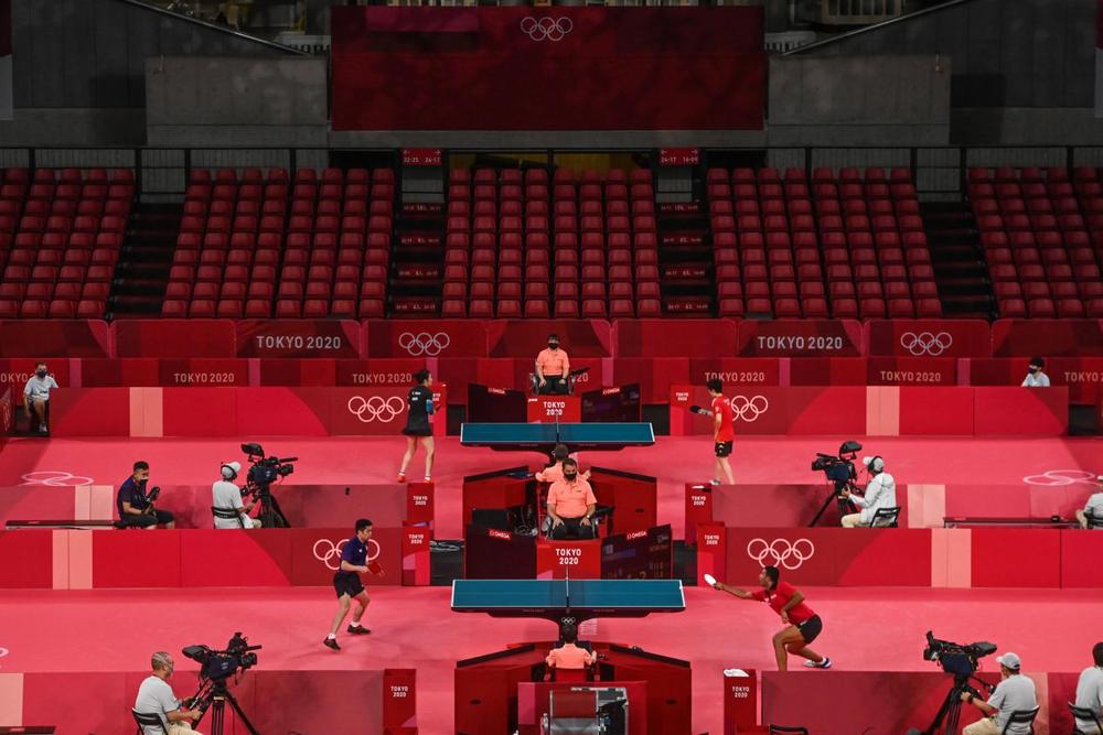 7月27日,乒乓球比赛继续在东京体育馆内举行。红彤彤的赛场,运动员赛得火热,唯独空旷的看台诉说着这届奥运会的特殊。