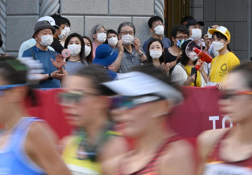 8月6日,札幌市民在街头观看东京奥运会女子20公里竞走比赛。东京奥运会少数几个在城市街道的比赛成了日本观众为数不多可以现场观看的机会。