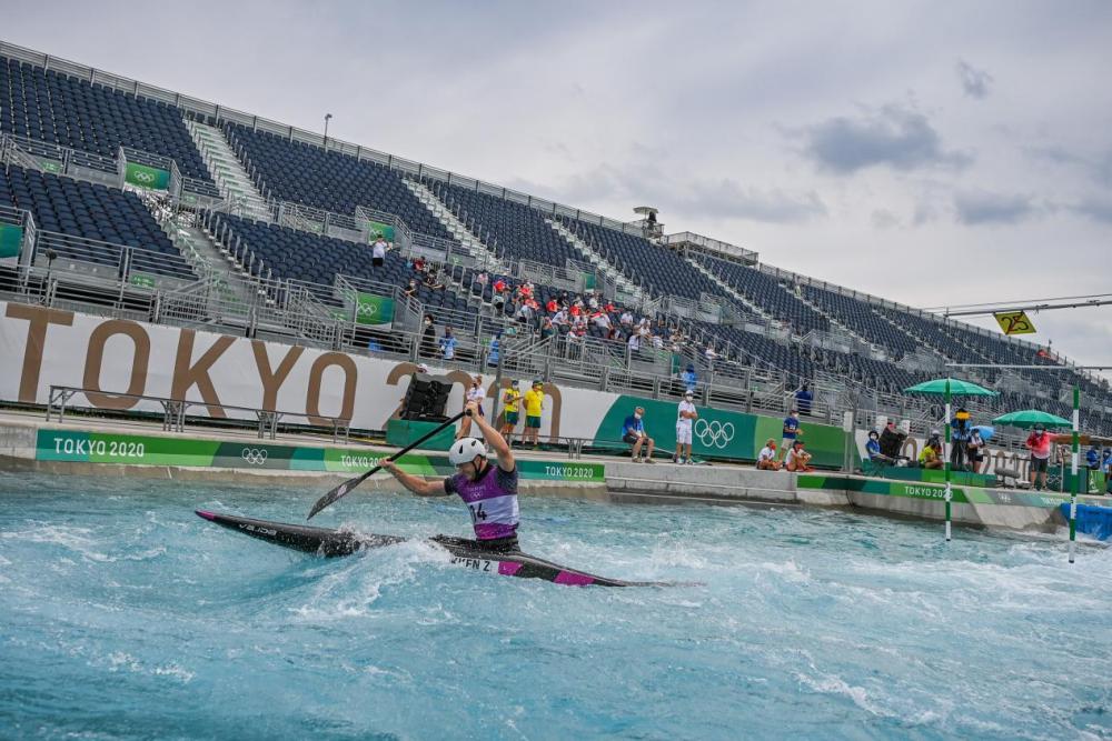 7月26日,美国选手洛肯在男子激流回旋中冲刺。看台上的人群,不是普通观众,而是各代表团成员。