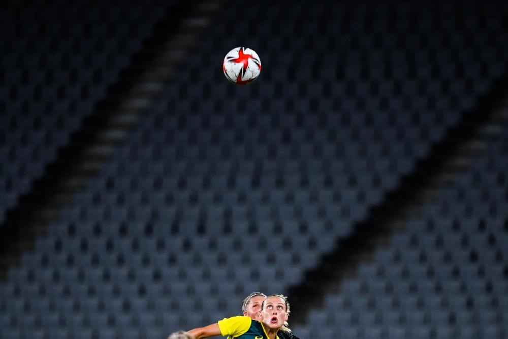 7月21日,澳大利亚队员和新西兰队员在女足小组赛中争抢头球。这是我拍摄的第一场奥运会比赛,能容纳5万人的东京体育场的看台上空无一人。