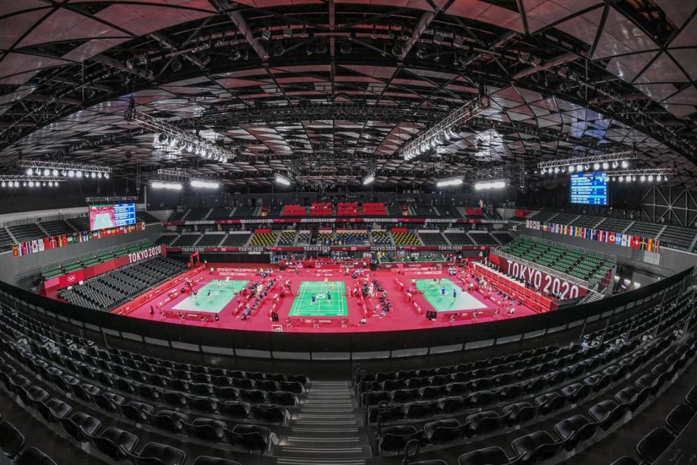 7月24日,武藏野森综合体育广场,奥运会羽毛球小组赛阶段比赛。坐在看台的最后一排,鱼眼镜头下的场馆,如同一只眼睛,注视着空旷的赛场。