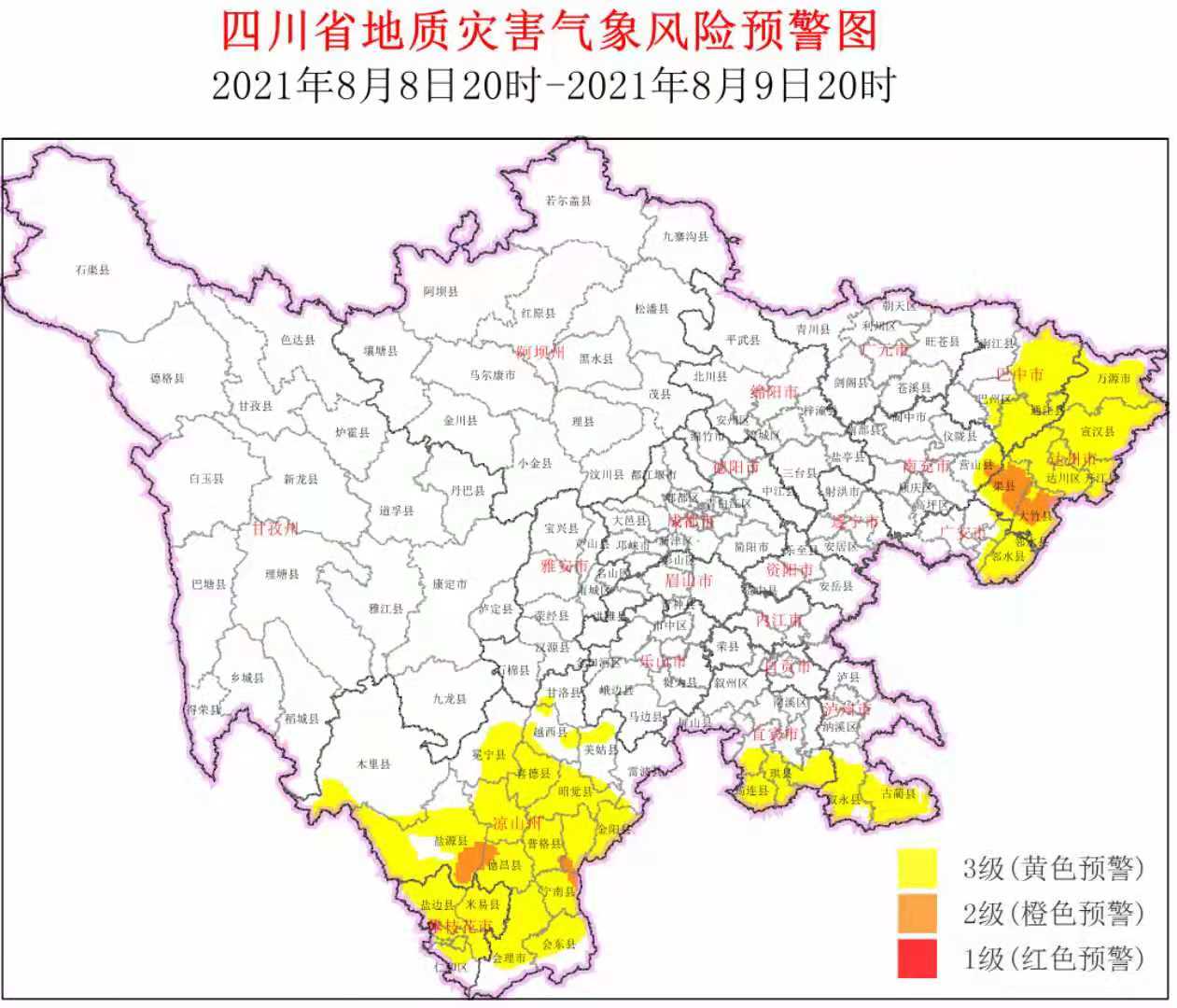 2级橙色预警区域为达州渠县、大竹县,南充营山县,凉山州盐源县、德昌县、宁南县、普格县、布拖县等3市(州)8个县;3级黄色预警区域为巴中巴州区、通江县、平昌县,达州通川区、达川区、万源市、宣汉县、开江县,广安广安区、前锋区、华蓥市、邻水县,宜宾高县、长宁县、珙县、筠连县、兴文县,泸州古蔺县、叙永县,攀枝花东区、西区、仁和区、米易县、盐边县,凉山州西昌市、会理市、木里县、会东县、金阳县、昭觉县、喜德县、冕宁县、越西县、甘洛县、美姑县、雷波县等7市(州)36个县(市、区)。